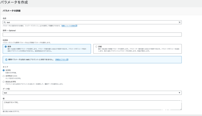 AWS System Managerからパラメータストアの作成で以下の内容で入力、作成。