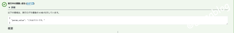 Lambdaのテストを実行して、パラメータストアから値が取得できれば成功。