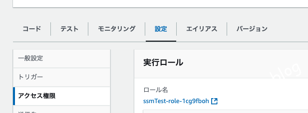 Lambdaの設定タブ内にある「アクセス権限」にあるロール名を選択。
