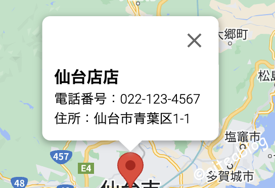 content: `<div><h2>XXXXX</h4><p>電話番号:XXXXX</p><p>住所:XXXXX</p></div>`, // 情報ウィンドウに表示するコンテンツを指定